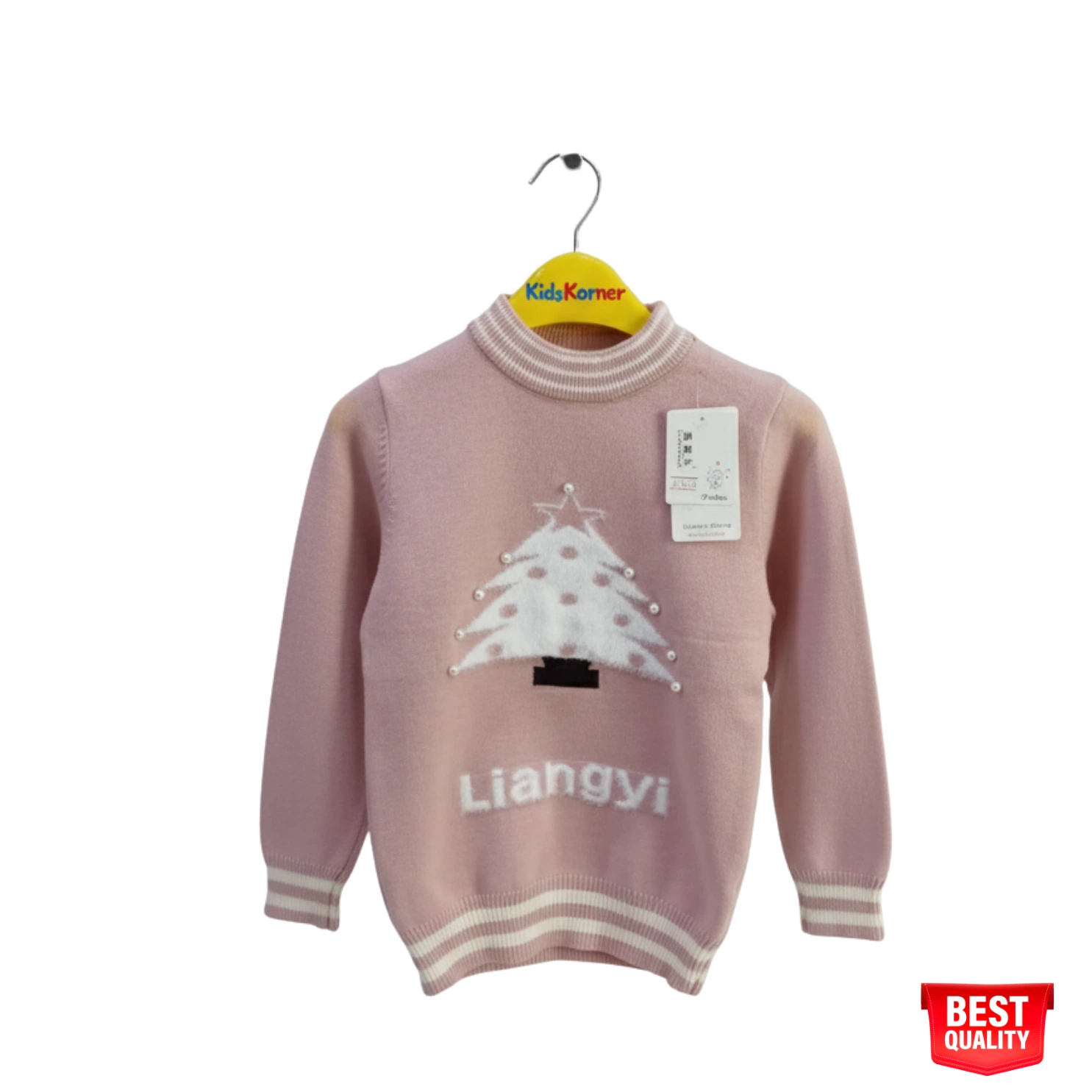 Girls Pink Christmas Tree Sweater – Cozy Knit Pullover with “Liangyi” Detail