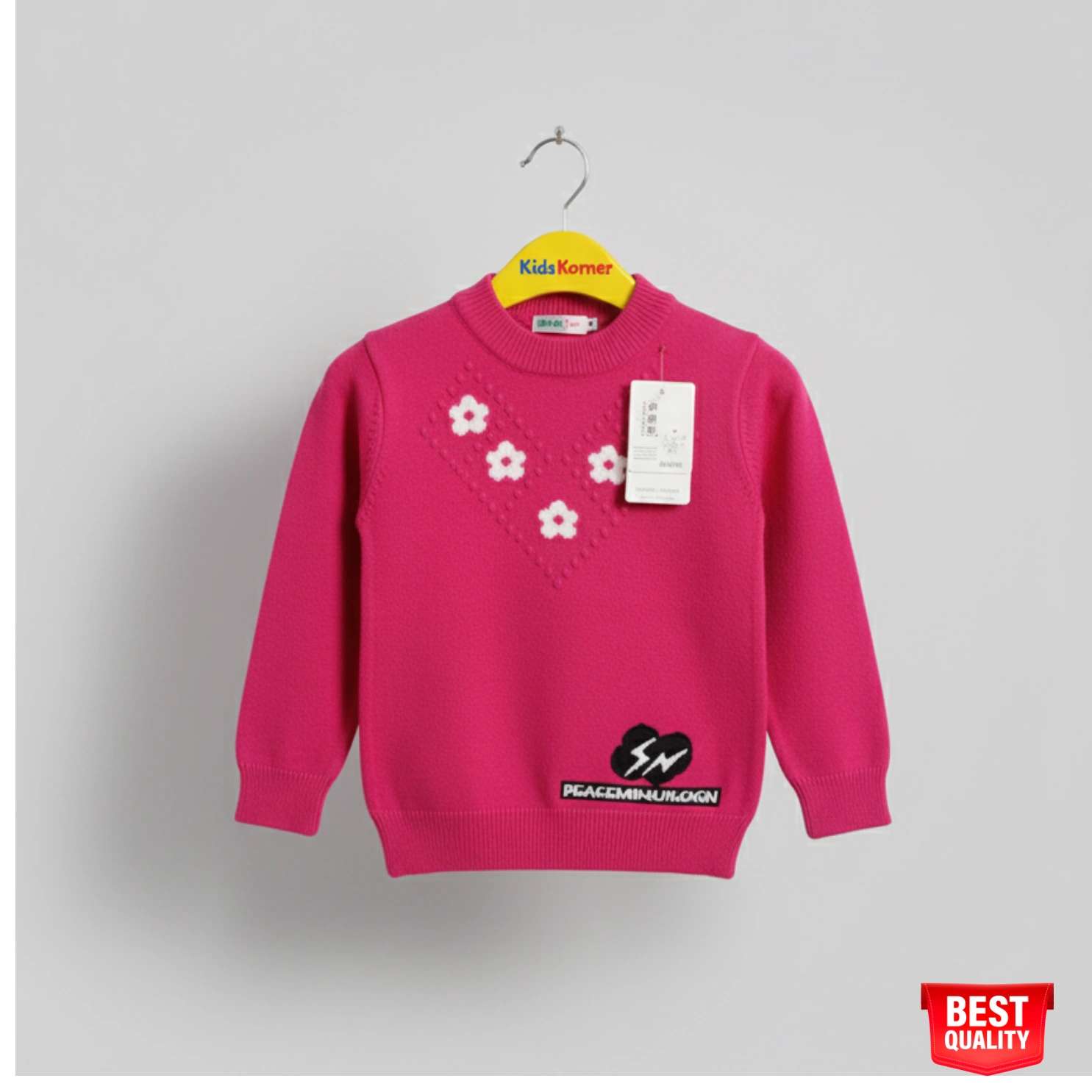 This adorable pink sweater for girls is the perfect blend of comfort and style. Featuring a beautiful floral design on the front with soft, white flowers, this sweater is both fashionable and cozy. The cute “PEACEMINUSONE” detail at the bottom adds an edgy yet stylish touch, making it a standout piece in your toddler’s wardrobe.