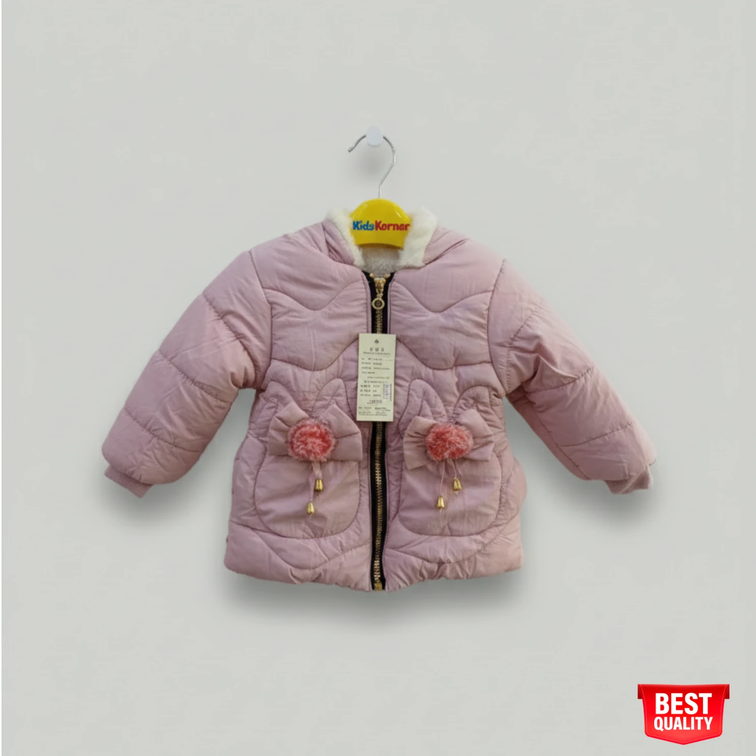 This adorable pink quilted winter jacket is the perfect blend of warmth and style for your little one. Made with soft, quilted fabric, this jacket is designed to keep your toddler warm and cozy during the colder months. The vibrant pink color adds a playful touch, while the cute pom-pom accents on the pockets and faux fur collar elevate the jacket’s charm.