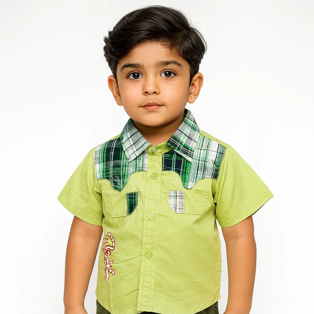 Add a touch of playful style to his wardrobe with this unique green button-down shirt from Kids Korner. This shirt features a cool combination of a solid light green body and a contrasting plaid pattern on the collar, shoulders, and pocket flaps. The plaid design includes shades of dark green, grey, and white, giving it a fresh, layered look. A distinctive embroidered pattern with red stitching on the front adds a final special touch. With its short sleeves and classic button-down style, this shirt is perfect for a sunny day out, a family event, or a casual get-together. It’s a comfortable and fashionable choice that will have him looking his best.