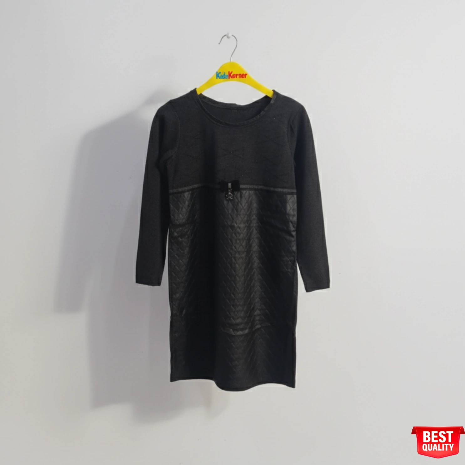 This sophisticated black kids dress is the perfect combination of comfort and style. Featuring a soft, cozy top with geometric patterns and a quilted leather-like bottom, this dress offers a unique blend of textures. The subtle button detail at the waist adds a chic touch, making it ideal for both casual outings and more formal occasions. The long sleeves and soft fabric ensure warmth, while the stylish design makes it a standout piece in your child’s wardrobe. Perfect for a trendy, fashionable look.