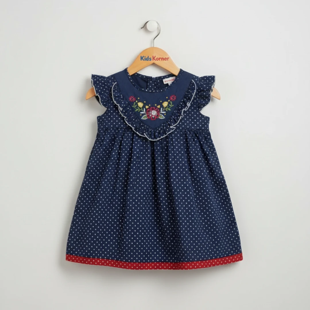 This lovely polka dot dress is the perfect addition to your baby girl’s wardrobe. The dress is made from soft, breathable fabric that ensures comfort throughout the day. The navy blue color with cute white polka dots gives it a classic look, while the floral embroidery on the chest adds a lovely, elegant touch. Designed for easy dressing, this dress is perfect for baby girls who love comfort and style.